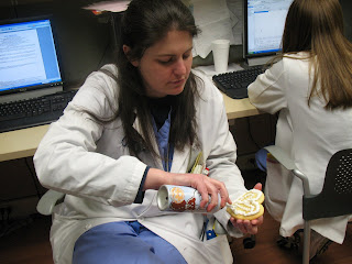 ANYWAY, back to the sugar cookies. I'm pretty picky about my sugar cookies. I don't like them thin and crispy but a little bite around the edges is good. These had a great texture. As to taste, I thought they were a little bland. Don't really know what needs to be added, but if you are putting icing on them anyway, it doesn't matter that much! I decided to just take the plain cookies, a spray can of icing, and a selection of sprinkles to our team room. They turned out to be a hit! One of our interns wasn't feeling good that day and the "blandness" was good for him. The other intern had fun sweetening her cookies.