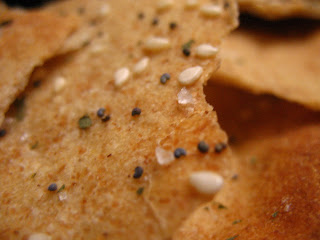 5. Preheat the oven to 350 degrees Fahrenheit with the oven rack on the middle shelf. Mist the top of the dough with water and sprinkle a covering of seeds or spices on the dough (such as alternating rows of poppy seeds, sesame seeds, paprika, cumin seeds, caraway seeds, kosher or pretzel salt, etc.) Be careful with spices and salt - a little goes a long way. If you want to precut the cracker, use a pizza cutter (rolling blade) and cut diamonds or rectangles in the dough. You do not need to separate the pieces, as they will snap apart after baking. If you want to make shards, bake the sheet of dough without cutting it first.