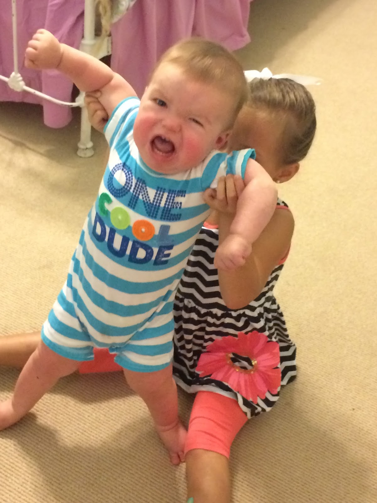 Milestones: He can balance for a few seconds without holding on. He is definitely getting better at cruising and walking assisted. In fact, he gets SO excited when you put him behind his walker. He just grins!